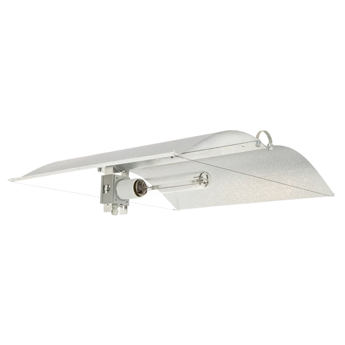 The Adjust-a-Wings Avenger reflector works with any horizontally mounted E40 single ended HPS or MH grow light.